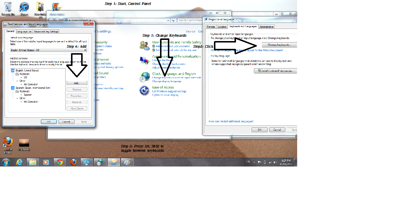 Language learning tip #4: This will be for more advanced people in a language, but try to add a different keyboard to your computer’s settings. You can easily add almost any language through control panel/keyboards. Although your keyboard buttons will still be in whatever language they are currently, you can easily toggle between other languages when you are typing to get the feel for the other buttons.